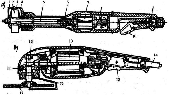 В угловой шлифовальной машине (рис. 13.29, б) встроенный в ее корпус электродвигатель 13 питается электроэнергией от внешнего источника, с которым он соединен кабелем 14. Включают двигатель выключателем 15. Вращение шпинделю 12 с закрепленным на его конце рабочим инструментом 17 передается от электродвигателя через одноступенчатый конический редуктор 11. Как и в случае прямой машины, рабочий инструмент защищен на половину его диаметра кожухом 16.