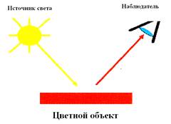 Отражение (пропускание) света. Основную часть объектов, вызывающих цветовые ощущения, составляют несамосветящиеся предметы, которые лишь отражают или пропускают свет, излучаемый источниками. И для получения цветового ощущения в этом случае необходимы: источник света, цветной объект и наблюдатель (рис. 3.2).