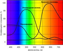Рис. 3.3 Спектры отражения различных цветных красок: изумрудной зелени, красной киновари, ультрамарина