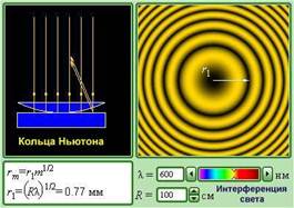 Первый эксперимент по наблюдение интерференции света в лабораторных условиях принадлежит Ньютону. Он наблюдал интерференционную картину, возникающую при отражении света в тонкой воздушной прослойке между плоской стеклянной пластиной и плосковыпуклой линзой большого радиуса кривизны. Интерференционная картина имела вид концентрических колец, получивших название колец Ньютона.