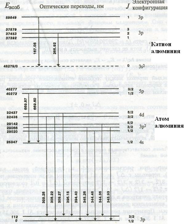 Рис. 2.2. Основные и возбужденные состояния атома и катиона алюминия. Показаны разрешенные оптические переходы.
