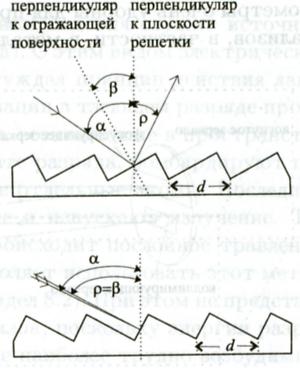 Рис. 2.12. Решетки типа эшелетт (вверху) и типа эшелле (внизу): a - угол отражения; r - угол отражения; b - «угол блеска»; d – расстояние между отражающими поверхностями.