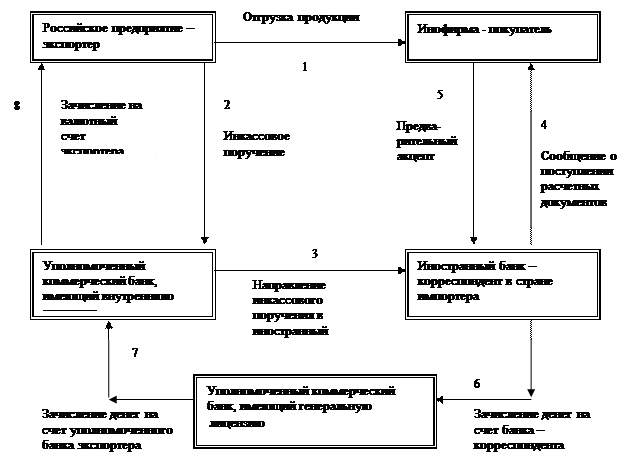 В инкассовом поручении предприятие экспортер дает точное указание иностранному банку, инкассирующему платеж, точное указание, когда он может передать импортеру коммерческие документы на получение товара. Возможны 2 случая: первый - коммерческие документы передаются сразу после уплаты валюты платежа; второй – товар продается в кредит, поэтому товарно-транспотрные документы передаются импортеру против акцепта срочной тратты. Акцептованная тратта означает принятие импортером на себя безусловного обязательства оплатить указанную сумму в указанный срок. Банки обязаны полностью контролировать весь документооборот по инкассовым поручениям, акцептам, траттам и т.д.