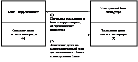 Сообщение клиенту – экспортеру о выставлении ему документарного аккредитива производится его банком в виде сопроводительного письма. Если экспортер согласен с условиями аккредитива, то он обязан в установленный срок произвести отгрузку товаров. После отгрузки товаров, выполнения работ, оказания услуг организация – экспортер, получив транспортные документы вместе с другими документами, предусмотренными условиями аккредитива, сдает их в свой банк. Представленные документы проверяются банком. Проверенные документы направляются в банк – эмитент (т.е. банк импортера, открывший аккредитив экспортеру) для оплаты счета, либо акцепта тратты. Банк – эмитент проверяет поступившие документы и лишь после этого переводит сумму платежа банку экспортера, дебетуя счет импортера. Банк экспортера зачисляет выручку на счет экспортера, а импортер, получив от банка – эмитента документы, вступает во владение товаром.
