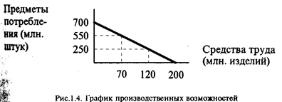 В табл. 1.1. указаны не только крайние, но и промежуточные случаи альтернативного применения производственных факторов. Это позволяет построить график производственных возможностей - кривую, которая очерчивает границу полного использования хозяйственных ресурсов (рис. 1.4.).