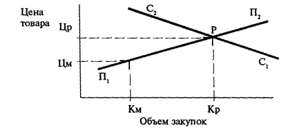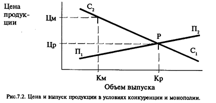 Предположим, что в какой-то отрасли до захвата ее рынка монополией (то есть в условиях конкуренции) цена равновесия (Цр) образовалась на уровне точки равновесия (Р), где пересеклись кривая спроса (С1-С2) и кривая предложения (П1-П2). При этом равновесный объем выпуска продукции составил величину