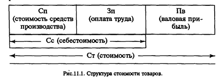 1-й фактор, определяющий величину прибыли, - себестоимость изделий: расходы бизнесмена на производство товаров. Прежде всего важно заметить отличие себестоимости от стоимости товара. Как нам известно, стоимость товара (Ст) включает стоимость затраченных средств производства (Сп) и добавленную (новую) стоимость (Сд). В свою очередь, добавленная стоимость распадается на заработную плату (Зп) и валовую прибыль (Пв). Соотношение основных составных частей стоимости (соответственно цены) изготовленных товаров изображено на рис.11.1.