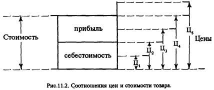 Во-первых, цена (Ц) может устанавливаться ниже себестоимости изделий, в результате чего они реализуются в убыток. Во-вторых, денежная выручка за товар (Цд) совпадает с издержками предприятия, что обеспечивает лишь самоокупаемость производства. В-третьих, если цена (Ц,) выше себестоимости и ниже стоимости, то предприятие получает прибыль в меньшем размере, чем величина заключенной в товаре прибыли. В-четвертых, когда цена (Ц^) совпадает по своей величине со стоимостью, то бизнесмен получает всю прибыль, заключенную в товаре. Наконец, если рынок позволяет получать за товар больше денег (Ц;), чем величина стоимости, то бизнесмен получает сверхприбыль, а общая величина его дохода оказывается больше созданной прибыли.