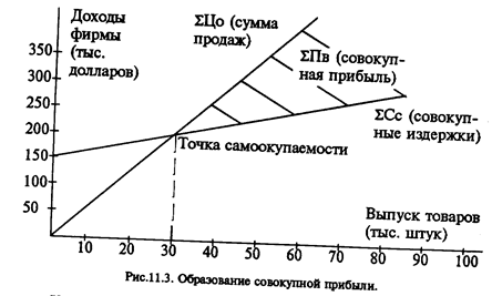Затем наступает такой момент, когда скажется эффект увеличения масштабов производства: при росте размеров выпуска изделий себестоимость каждого из них будет снижаться (из-за относительной экономии постоянных затрат в расчете на единицу продукции). Сначала сумма продаж сравняется с величиной совокупных издержек (åСс), то есть будет достигнута точка самоокупаемости производства. В дальнейшем после прохождения этой точки - наращивание выпуска товаров приведет к образованию валовой прибыли, масса которой будет все время возрастать. Наглядной иллюстрацией такого процесса служит рис. 11.3 (цифры условные).