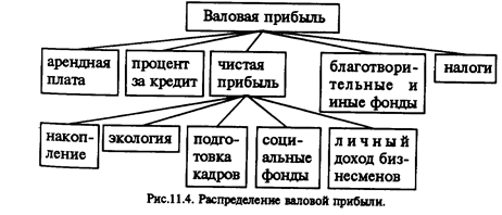 Прежде всего из валовой прибыли вычитаются суммы, уходящие "на сторону". Сюда относятся арендная плата за пользование чужой землей или зданиями (находящимися в иной собственности), а также процент за заемные денежные средства. Кроме о, предприятие вносит налоги в бюджет государства и местных органов власти, вкладывает средства в благотворительные и иные фонды. Оставшаяся часть средств образует чистую прибыль. Она используется на производственные и социальные потребности предприятия, в том числе на накопление (расширение производства), на охрану окружающей среды, подготовку и переподготовку кадров, социальные потребности работников предприятия и другие цели.