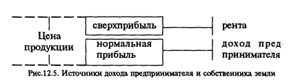 Рентные отношения представляют собой по существу отношения между собственником земли и арендатором по распределению прибыли. Одна ее часть - в виде обычной прибыли - достается предпринимателю, а другую долю - в форме сверхприбыли - получает земельный собственник (рис. 12.5.).