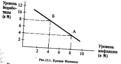 Безработица и инфляция находятся в определенной количественной зависимости. Профессор Лондонской экономической школы А. Филипс в конце 50-x годов установил такую закономерность: чем ниже уровень инфляции, тем выше уровень безработицы, и наоборот - это объяснимо. С повышением уровня безработицы уменьшается покупательная способность населения. Безработица отрицательно сказывается на уровне оплаты труда. В итоге уровень жизни снижается. Этот процесс наглядно представлен в виде кривой Филипса (рис. 15.1.).
