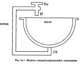 Представим себе гигантскую ванну. В ней объем "воды" ("запас") соответствует объему выпускаемой продукции и занятости рабочей силы. Сливная труба (Сб) изображает поток сбережений населения. Кран обозначает ставку процента (Пц), которая соединяет поток сбережений и поток инвестиций (И), пополняющий ванну.
