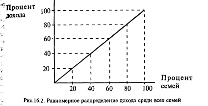 График на рис. 16.2. демонстрирует абсолютное равенство в распределении дохода в обществе. Как видно, любой данный процент семей получает соответствующую долю дохода (20% семей имеют 20% дохода, 40% семей - 40% дохода и т.д.). По-видимому, такое распределение теоретически предопределяет социальную стабильность общества.