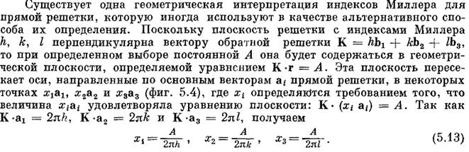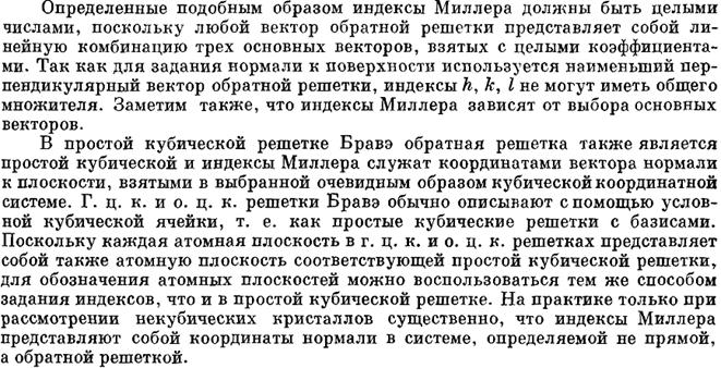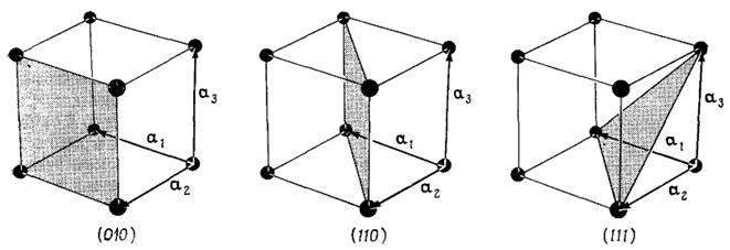 В кубической решетке индексами Миллера плоскости называются индексы Миллера ортогонального ей направления. Для обобщения на другие типы решеток положение плоскости в кристалле характеризуют отрезками, отсекаемыми ею на кристаллографических осях а/x1, b/ x2, c/ x3, где 1/x1, 1/ x2, 1/ x3 - доли периода, отсекаемые рассматриваемой плоскостью на соответствующих осях координат. Под индексами плоскостей понимают величины, обратные длинам этих отрезков, приведенные к целым числам (и отнесенные к обратным значениям периодов решетки), то есть, индексы плоскости будут (A/x1, A/ x2, A/ x3), где A подбирается так, чтобы сделать эти числа целыми с наибольшим общим делителем 1. Их называют индексами Миллера плоскости и заключают в круглые скобки ((hkl) или (h1, h2, h3)). Отрицательные значения обозначают чертой сверху