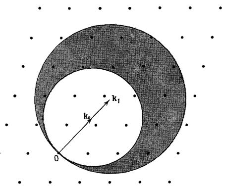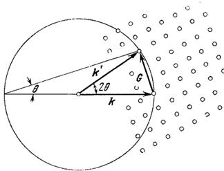 Волновой вектор k падающей волны упирается в узел обратной решетки. Проводится сфера радиуса k. Дифракция наблюдается в направлении узлов решетки на окружности.