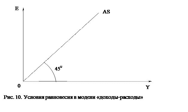 Условие равновесия в данной модели: AD=AS (AD=Е-расходы; AS=У- доходы, т.е. Е=У). Графически, условие равновесия задается с помощью биссектрисы. Все точки на этой линии показывают равенство всех доходов и расходов в экономике. Так как цены фиксированы, то эту линию можно рассматривать как совокупное предложение в экономике.
