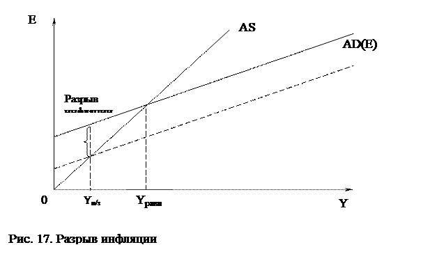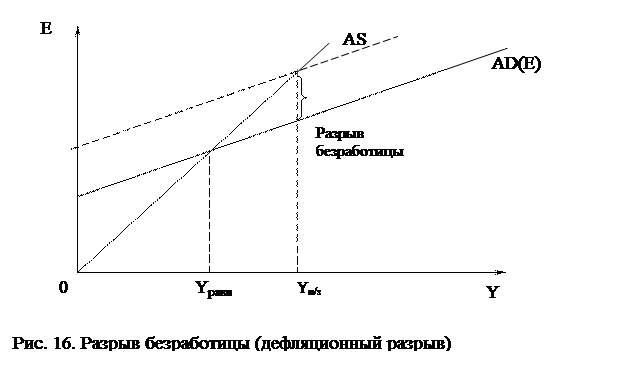 Если равновесие достигается в точке ниже естественного уровня производства, то в экономике буде наблюдаться безработица. Если выше естественного уровня производства, то инфляция. Дефляционный разрыв – это величина, на которую совокупные расходы меньше уровня национального дохода при полной занятости (рис.16).