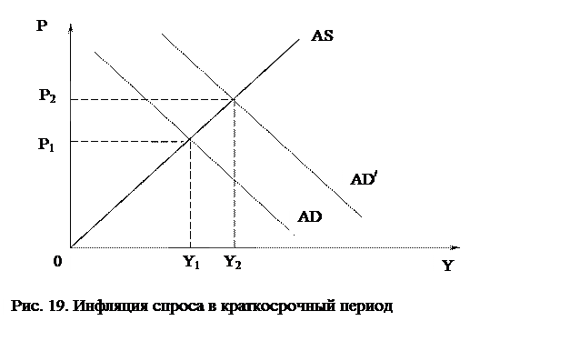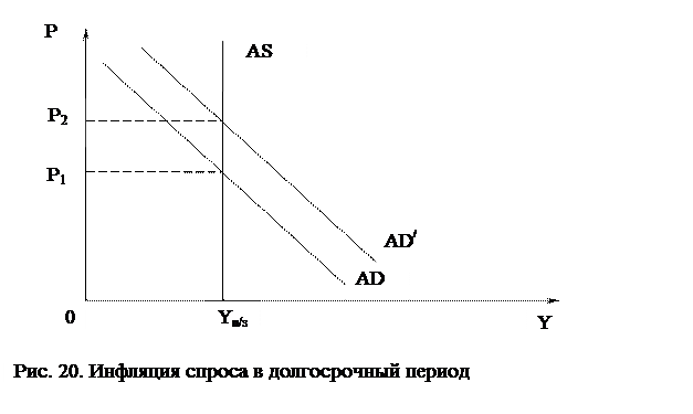 Графически инфляция спроса выражается смещением вверх кривой совокупного спроса (рис. 19). Совокупный спрос может изменяться как вследствие изменений на товарном рынке, так и в результате изменений на рынке денег. Изменения на товарном рынке обычно не происходят непрерывно (это скорее временные шоки, чем перманентные, поскольку есть естественные ограничения на снижение налогов или рост государственных расходов). В то же время, изменение на рынке денег действительно могут происходить практически непрерывно в силу отсутствия естественных ограничений на темп роста предложения денег. Таким образом, именно непрерывная денежно-кредитная экспансия в большинстве случае является причиной устойчивого повышения роста цен или инфляции.