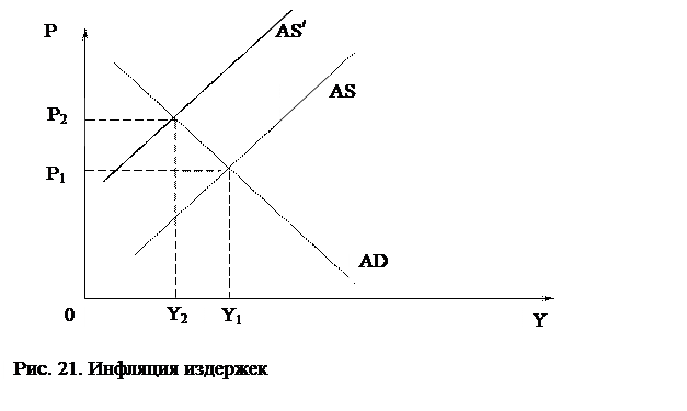 Инфляция издержек – это рост цен, вызываемый факторами, которые приводят к увеличению издержек производства. Обычно такими факторами являются рост заработной платы цены на материальные ресурсы. Графическая интерпретация инфляции предложения представлена на рисунке.