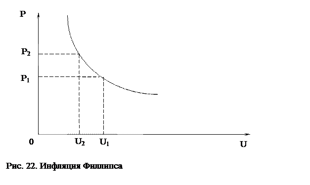К позитивным последствиям применения дефляционной политики можно отнести, то, что она обеспечивает снижение инфляционного роста цен без прямого вмешательства в действие рыночного механизма. Недостатком же ее применения является значительное падение производства и занятости. Связь между уровнем инфляции и безработицы может быть представлена графически в виде кривой Филлипса (см. рис.).