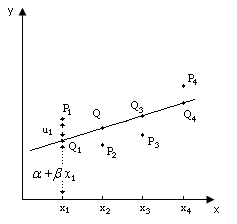На рис. 2.2 (слайд) показано, как комбинация этих двух составляющих определяет величину у. Показатели х1, х2, х3, х4 - это четыре гипотетических значения объясняющей переменной. Если бы соотношение между у и х было точным, то соответствующие значения у были бы представлены точками Q1, Q2, Q3, Q4 на прямой. Наличие случайного члена приводит к тому, что в действительности значение у получается другим. Предполагалось, что случайный член возмущения положителен в первом и четвертом наблюдениях и отрицателен в двух других. Поэтому если отметить на графике реальные значения у при соответствующих значениях х, то мы получим точки P1, P2, P3, P4.