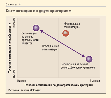 Последние достижения в области маркетинга и технологий моделирования позволяют теперь использовать недавно еще неприменимые схемы сегментации[20]. По сути, модель оптимизации сегментных решений, жертвуя некоторой аккуратностью разграничения сегментов, гораздо точнее определяет принадлежащих к ним потребителей. Достигается этот эффект благодаря оптимизации функции, которая представляет собой средневзвешенное значение, полученное на основе данных двух принципов сегментации — демографического и основанного на анализе прибыльности клиентов (см. схему 4).