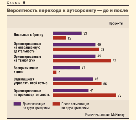 Анализ показал, что связь между объемом закупок и восприимчивостью потребителей была довольно слабой, и это не стало неожиданностью. Удивительно было другое: к аутсорсингу склонялись только четыре из шести сегментов, да и то с вероятностью 40-50%. Поняв, что из шести сегментов перспективными оказались четыре (стремящиеся поднять свою производительность, ориентированные на повышение операционной эффективности, усиление роли технологий и ценящие возможность управлять всей сетью), компания растерялась, поскольку не знала, на скольких и на каких именно сегментах сосредоточиться.