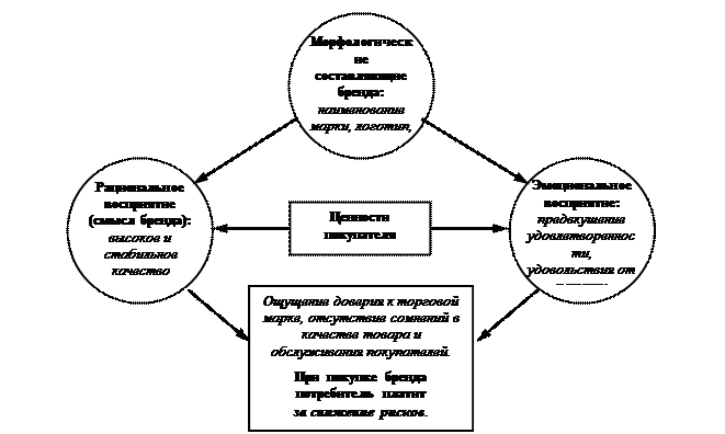 Семантика (смысл) знаковой формы, обозначающей бренд, должна связывать объект этой формы с определенными ценностями покупателя. Тем самым образуется смысловое значение бренда. Как правило, смысловое значение бренда состоит в том, что в сознании покупателя название марки ассоциируется с высоким и стабильным качеством, обязательно присущим товару. Характеризуя бренды будущего, Кевин Робертс, глава крупнейшей рекламной компании Saatchi & Saatchi назвал их lovemarks, то есть «знаки любви»[25]. Однако этого недостаточно для формирования бренда. Помимо смысла, складывающегося в сознании покупателя, важна указанная выше эмоциональная нагрузка бренда. Совокупное действие смысловой и эмоциональной составляющих бренда на покупателя можно характеризовать как ощущение доверия к производителю (торговой марке). Это доверие предполагает, в частности, отсутствие сомнений в качестве товаров и обслуживания покупателей. Роль бренда, в таком случае, заключается в том, что при его покупке потребитель платит за снижение рисков.