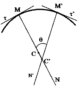 Чтобы пояснить этот параметр R, рассмотрим небольшой фрагмент плоской криволинейной траектории. В близких точках М и М’ проведём касательные к траектории t и t’, а к ним восстановим перпендикуляры N и N’ (рис. 2.13). Они пересекаются в точке C’.
