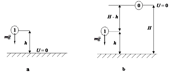 Если же уровень потенциальной энергии выбрать на высоте H (H > h), то работа совершаемой силой тяжести при переходе на этот уровень будет отрицательной. Следовательно, отрицательна и потенциальная энергия тела в состоянии 1 (рис.6.7, б)