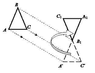 Любое движение твёрдого тела может быть представлено суперпозицией двух движений — поступательного и вращательного. Проиллюстрируем это утверждение простым примером (рис. 9.1). Пусть треугольник ABC в произвольном движении перемещается в положение A1B1C1. Можно представить, что это перемещение происходит в два этапа. Сначала треугольник, двигаясь поступательно, занял позицию A’B1C’, а затем во вращательном движении вокруг оси, проходящей через B1, занял конечное положение A1B1C1.