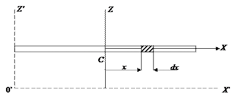 В качестве примера вычислим момент инерции тонкого однородного стержня относительно оси z, проходящей через его центр масс — точку С (рис. 9.3). Длина стержня — l, его масса — M.
