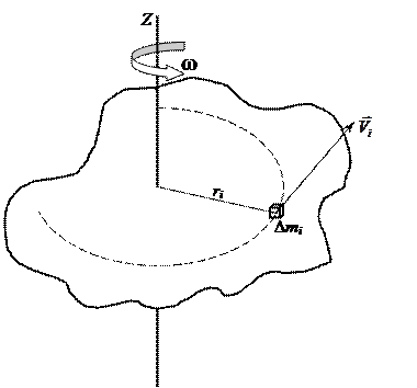 В твёрдом теле, вращающемся с угловой скоростью w относительно неподвижной оси z, выделим элемент массой D mi. Эта частица будет двигаться по окружности радиуса ri с линейной скоростью Vi = w ri (рис. 10.3).