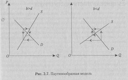 На рис. 2.7 представлены два случая паутинообразного изменения цены. В первом случае (рис. 2.7а) угол наклона к оси объемов у кривой спроса меньше по сравнению с кривой предложения, и цена стремится к своему равновесному значению. Во втором случае (рис. 2.76), наоборот, кривая спроса расположена круче по отношению к оси объемов, чем кривая предложения, и колебания цены вокруг равновесного значения увеличиваютсяура потребления этих товаров владельцами факторов производства.