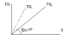 В условиях совершенной конкуренции цена определяется рынком, а отдельная фирма, занимая ничтожно малую долю рынка, принимает ее как заданную (является ценополучателем), т.е. может продать любое количество своей продукции по фиксированной рыночной цене. Поэтому функция выручки конкурентной фирмы от выпуска линейна, причем тангенс угла наклона линии TR равен цене товара (рис. 12):