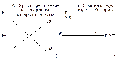 На рис. 12-А изображены кривые спроса и предложения на рынке данного товара. Здесь сталкиваются сотни продавцов и тысячи покупателей, соответственно величины спроса и предложения (Q) измеряются многими тысячами, а может быть и миллионами единиц продукции. В результате взаимодействия предложения и спроса формируется равновесная рыночная цена товара (Р*). На рис. 12-Б наблюдаем положение отдельной фирмы, представляющей собой песчинку в рыночном масштабе. Фирма принимает рыночную цену как заданную и способна продать любое количество своей продукции по этой цене. Иными словами, покупатели могут приобрести любое количество продукции фирмы по равновесной рыночной цене: кривая рыночного спроса на продукт отдельной совершенно конкурентной фирмы – горизонтальная линия.