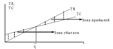 . Если фактический выпуск окажется меньше этой величины, фирма понесет убыток, ибо затраты превысят выручку (размер убытка будет равен расстоянию между линиями TC и TR). Если выпуск окажется больше, выручка превысит затраты, и фирма получит экономическую прибыль (ее размер будет равен расстоянию между линиями TR и TC).
