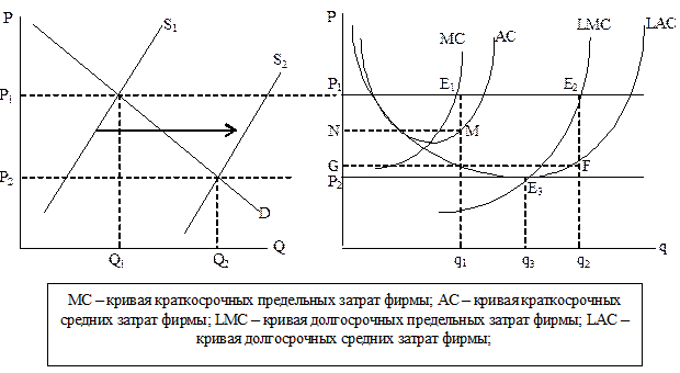 Однако все остальные фирмы также увеличивают свое производство, что ведет к росту рыночного предложения (сдвигу кривой предложения вправо на левом графике) и снижению цены. С другой стороны, в отрасль вторгаются новые фирмы, привлеченные экономической прибылью, что способствует дальнейшему увеличению предложения. Такой рост предложения продолжается до тех пор, пока кривая предложения не приходит из положения S1 в положение S2 (рис. 16-А). Цена при этом падает до уровня Р2, т.е. до уровня минимальных долгосрочных средних затрат типичной фирмы (рис. 16-Б). Таким образом, экономическая прибыль, получаемая типичной фирмой, исчезает. Новые фирмы перестают входить в отрасль, а действующие фирмы теряют стимул сокращать, либо расширять производство. Долгосрочное равновесие достигнуто.