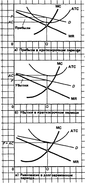 Экономические прибыли (а) побудят новые фирмы вступить в отрасль, в итоге в ходе конкуренции они будут ликвидированы. Убытки (б) вызовут массовый выход фирм из отрасли до тех пор, пока нормальные прибыли не будут восстановлены. Таким образом, если цена просто покрывает издержки на единицу продукции при объеме производства, для которого MR = МС (в), в долговременном периоде достигается положение равновесия.