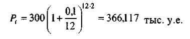 Пример 4.1. Найти разницу наращенных за два года значений на сумму 300 тыс. у.е. по ставке 10% при непрерывном и ежемесячном начислении процентов.