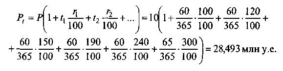 Пример 4.3. С учетом реальной экономической ситуации в стране банк поставил следующие условия выдачи ссуды в сумме 10 млн у.е. на один год: за первые 60 дней ссудный процент равен 100%; за следующие 60 дней — 120%, за следующие 60 дней — 150%, за следующие 60 дней — 190%, за следующие 60 дней — 240% и за остальные 65 дней — 300%. Требуется определить сумму, возвращенную банку.