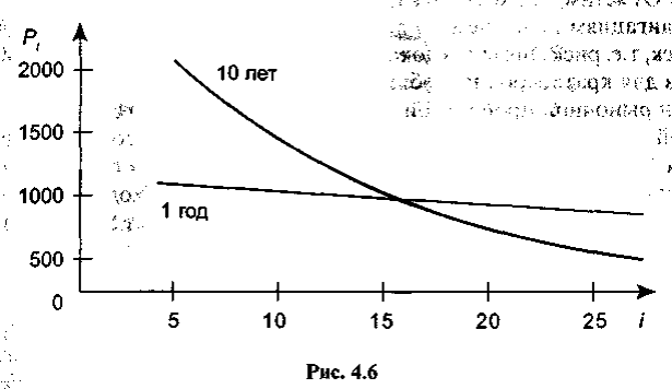 Из рис.4.6 видно, что цена долгосрочной облигации гораздо более чувствительна к изменению рыночной ставки, чем краткосрочной, так как рыночная цена облигации устанавливается на таком уровне, чтобы доходность облигации была равна текущей рыночной ставке.