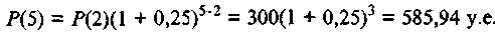 Пример 4.10. Долг в размере 300 у.е. должен быть выплачен через два года. Найти эквивалентное по ставке 25% значение через 5 лет.