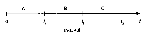 Пусть 0 — данный момент времени, тогда t1 — срок выплаты суммы A, t2 — срок выплаты суммы В и t3 — срок выплаты суммы С. Из эквивалентности А и В имеем:
