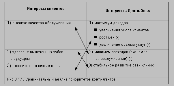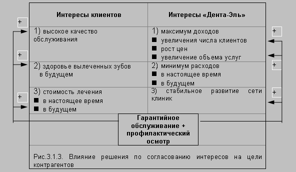 Рассмотрим интересы клиники "Денто-Эль". К ним относятся, в первую очередь, максимум доходов и минимум расходов. Максимум доходов может быть достигнут прежде всего путем постоянного увеличения числа клиентов. Действительно, поскольку до финансового кризиса 1998 г. сеть клиник постоянно расширялась, ей реально не угрожала опасность привлечения такого числа клиентов, обслужить которых она уже не сможет. Другие возможности повышения доходов - рост цен и увеличение объема услуг. Однако в рыночных условиях существенное повышения расценок по сравнению со сложившимся на рынке уровнем, а также проведение необоснованных врачебных манипуляций, конечно, не возможно. Это ограничение отражено на рисунке символом (-). Уменьшение издержек может быть в принципе основано на всевозможной экономии при обслуживании. Однако в условиях острой конкуренции этим способом можно пользоваться только в той мере, пока он не затрагивает качество обслуживания и здоровье пациентов. На третье место при рассмотрении целей клиник, с нашей точки зрения, можно отнести их стабильное развитие. Подобное относительное отставание данного направления связано в первую очередь с низкой приоритетностью стратегических планов современных российских предприятий. Какие же решения могут быть разработаны клиникой для большей гармонизации интересов? Обратим внимание на то, что приоритеты близких по смыслу целей клиники и ее клиентов не совпадают. Отличия обозначены на рисунке стрелками. Решение по гармонизации интересов должно быть найдено в области максимального расхождения приоритетов сторон, характеризуемой ситуацией в будущем, качеством обслуживания и ценами. Им явилось предоставление клиентам пятилетнего гарантийного (разумеется, бесплатного) обслуживания пломбы.