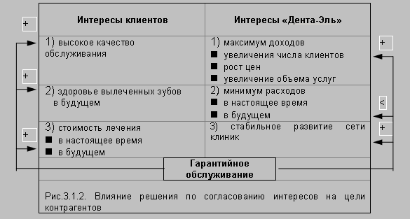 На Рис.3.1.2. показаны позитивные (+) и негативные (-) воздействия такого решения на интересы обеих сторон. В результате гарантийного обслуживания пациенты не только уменьшают свои будущие затраты. Не менее важным становится то, что тем самым внушается уверенность в высоком качестве произведенных работ. Очевидно, что гармонизация интересов при предоставлении гарантийного обслуживания пломбы происходит лишь отчасти, поскольку такая мера действительно помогает сохранить и увеличить число клиентов, что, несомненно, позитивно влияет на стабильное развитие клиники, однако существенно повышает ее расходы в будущем. Исходя из этого, было введено важное ограничение предоставления гарантийных услуг. Они оказываются только в случае прохождения пациентами профилактического осмотра не реже, чем раз в полгода. Такие осмотры бесплатны и, соответственно, требуют от клиники определенных, но все же относительно небольших затрат. Однако в результате становятся невозможны тяжелые, запущенные случаи, связанные с серьезными издержками по гарантийному обслуживанию. Кроме того, клиенты становятся постоянными, а при осмотре часто выявляется новый и на сей раз платный "фронт работы". Влияние такого дополненного решения по согласованию интересов показано на Рис.3.1.3.