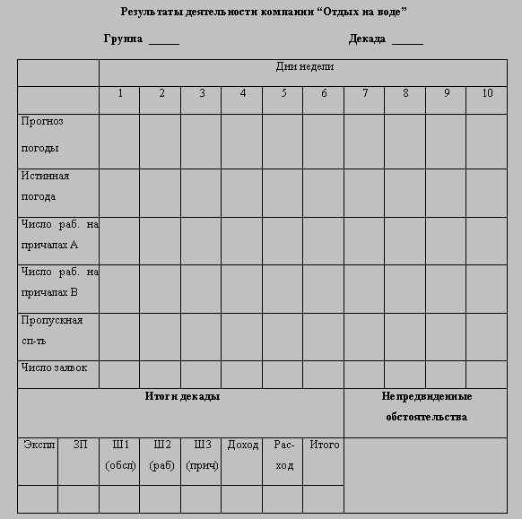 Доходы ( D) определяются путем умножения доходов от обслуживания одной лодки (4 $) на число лодок, обслуженных за декаду. Необходимо отметить, что число лодок, реально обслуженных в каждый день, равняется меньшему из двух чисел: пропускной способности лодочной станции в этот день и полученному числу заявок.)