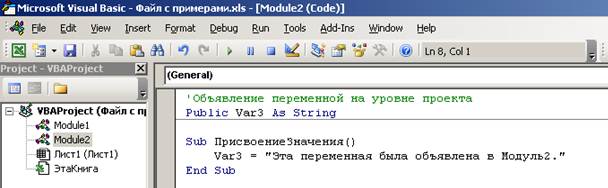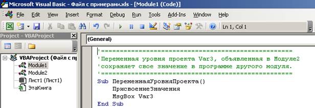 Переменная уровня проекта (или общего уровня) доступна и сохраняет свое значение в любом модуле проекта, содержащего ее описание. Чтобы сделать переменную доступной на уровне проекта, объявите ее с ключевым словом Public в разделе описаний любого модуля проекта, перед любыми подпрограммами и функциями. Мы написали две процедуры и разместили их в различных модулях. Одна из них присваивает значение переменной уровня проекта, а другая выводит его в информационном окне:
