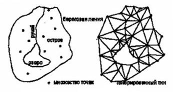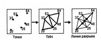 В процессе создания TIN соединяются нерегулярно разбросанные точки поверхности. Каждая точка имеет значение, поскольку определяет область структурного изменения. Например, соседние с вершиной холма точки определяют ее склоны, соседние точки вдоль реки, за исключением точки резкого понижения ее уровня, определяют долину реки. Все эти точки, используемые для построения TIN, называются массовыми, рис.14.